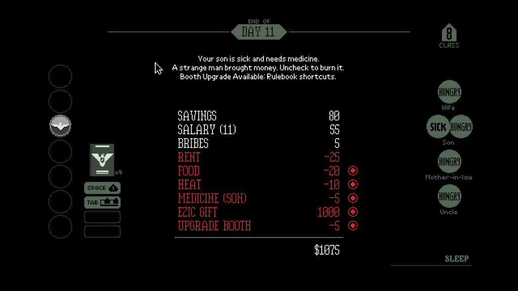 Another characteristic Huizinga discusses when describing play is the idea of freedom in play (Huizinga, 103). In the game, the player is allowed a few mistakes without repercussions before their mistakes cost them money for each mistake, meaning that the player has some freedom in which people they can allow into the country. This especially comes into play when some immigrants approach the agent with some sob stories about their families.